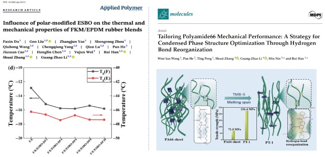 在高耐受聚合物基復合材料的微觀結構設計領域,李光照副研究員創新性地開發了環氧大豆油基增塑劑,顯著改善了氟橡膠與三元乙丙橡膠共混體系的低溫性能。實驗結果顯示,該增塑劑最高可使復合橡膠的玻璃化轉變溫度(Tg)降低3.54℃,相關成果發表于《Journal of Applied Polymer Science》期刊(圖4左)。王文燕博士則聚焦于尼龍66的凝聚態結構調控,創新性地在熔融紡絲過程中引入芳酰胺材料TMB-5,并利用二者相似的化學結構調控體系內分子間氫鍵網絡,從而實現凝聚態結構的定向優化。該工作從加工過程中的分子間動態作用層面深化了對聚合物結構?性能關系的理解,為發展高性能工程聚合物及纖維材料提供了有潛力的加工調控途徑,相關成果已在《Molecules》期刊正式發表。(圖4右)