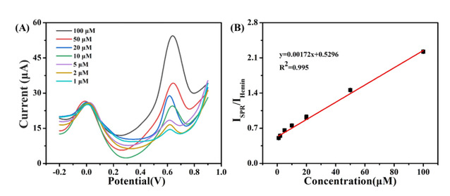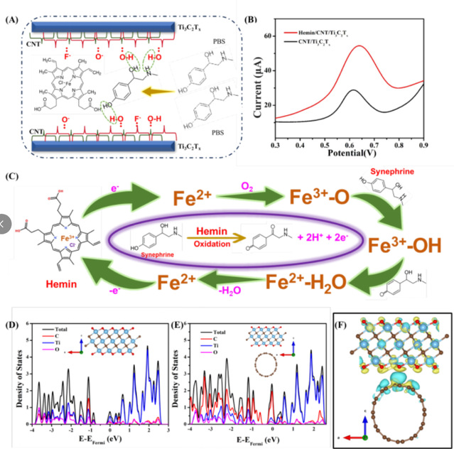 成功合成Hemin/CNT/Ti?C?T?功能雜化材料,其兼具優異的富集能力、高導電性和催化活性,基于該材料構建的比率電化學傳感策略,電化學信號與辛弗林濃度在1-100 μM范圍內呈現良好的線性關系,檢測限低至0.036μM,且具有出色的重復性、穩定性和抗干擾性。