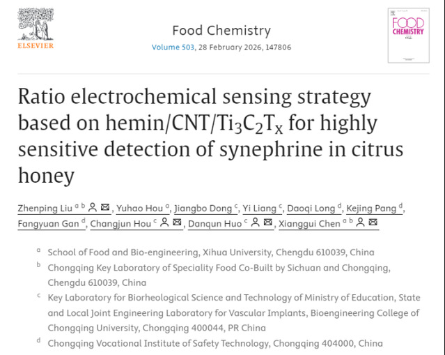 近日,食品與生物工程學院食品營養與安全團隊在《Food Chemistry》(中科院一區TOP,IF: 9.8)發表題為“Ratio electrochemical sensing strategy based on hemin/CNT/Ti3C2Txfor highly sensitive detection of synephrine in citrus honey”的研究性論文。食品與生物工程學院劉振平教授為第一作者,通訊作者為重慶大學侯長軍教授、霍丹群教授和西華大學食品與生物工程學院陳祥貴教授。
