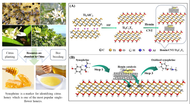 西華大學食品與生物工程學院依托“川渝共建特色食品重慶市重點實驗室” 與重慶大學、重慶安全技術職業學院共同開展科研攻關,創新開發了基于功能化材料Hemin/CNT/Ti?C?T?的比率電化學傳感策略,并成功應用于蜂蜜樣品中辛弗林含量的檢測。本研究實現了柑橘蜂蜜的真實性精準快速鑒別,為柑橘蜂蜜質量控制提供了可靠保障,也為柑橘蜂蜜資源的進一步開發利用奠定了基礎。