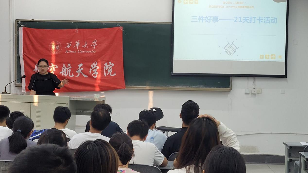9月29日下午,航空航天學院在6C116開展“三件好事——21天打卡活動”動員會。38名志愿者和各班心理委員參加了本次會議,會議由學工辦主任兼心理指導教師奉姣主持。