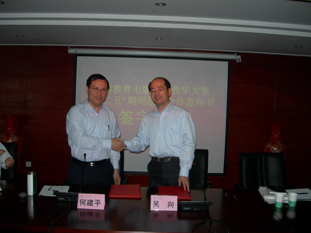 ????? 5月10日下午,我校與高等教育出版社 “十二五”時期戰略合作協議簽訂儀式在行政樓212會議室舉行。副校長何建平,高等教育出版社副總編吳向,教務處科級以上干部和學院分管教學工作負責人等出席簽約儀式。????? 何建平和吳向代表雙方簽訂了“十二五”時期項目合作意向書。雙方今后將采取項目合作的方式,共同開展學科建設、教學改革和教材建設工作,在特色學科、專業和課程建設、精品教材出版、高水平學術成果發表、師資培訓、多媒體教材和教學資源建設等方面加強項目合作。