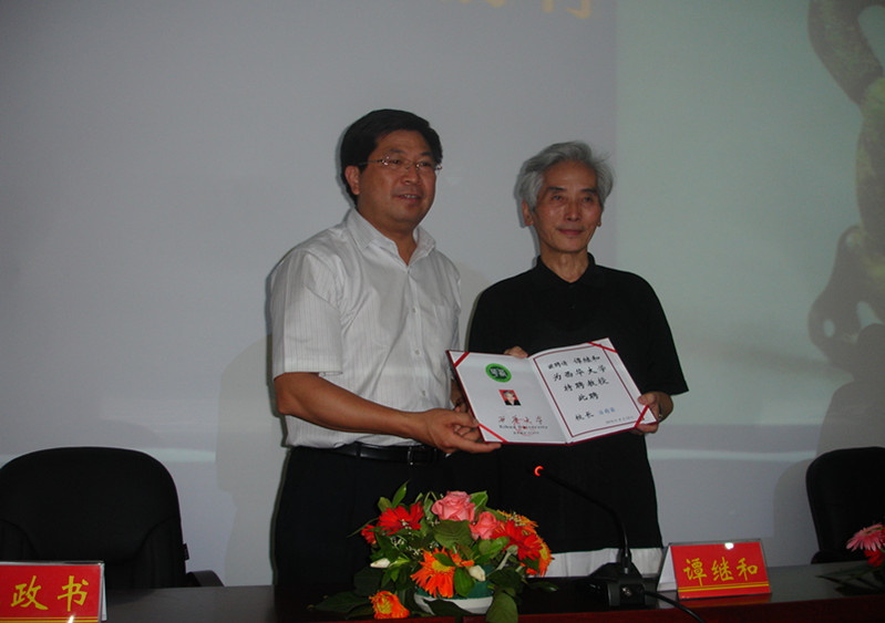 ????? 6月14日下午,應人文學院邀請,著名巴蜀文化研究專家、四川省社科院歷史研究所研究員譚繼和先生蒞臨“人文新視野”學術講壇,在新圖書館學術報告廳為師生們精彩解讀了神奇、神秘、神妙的巴蜀文化,并在講座結束后受聘為“西華大學特聘教授”。 副校長王政書為譚繼和先生頒發特聘教授聘書 譚繼和先生講學場景 |