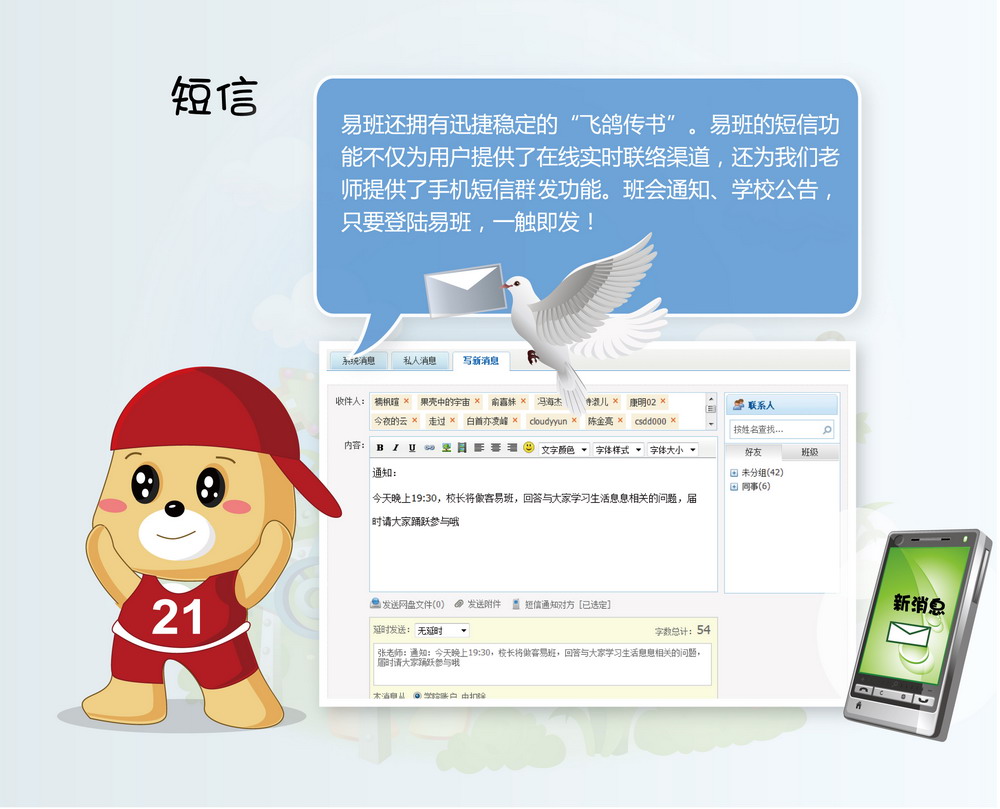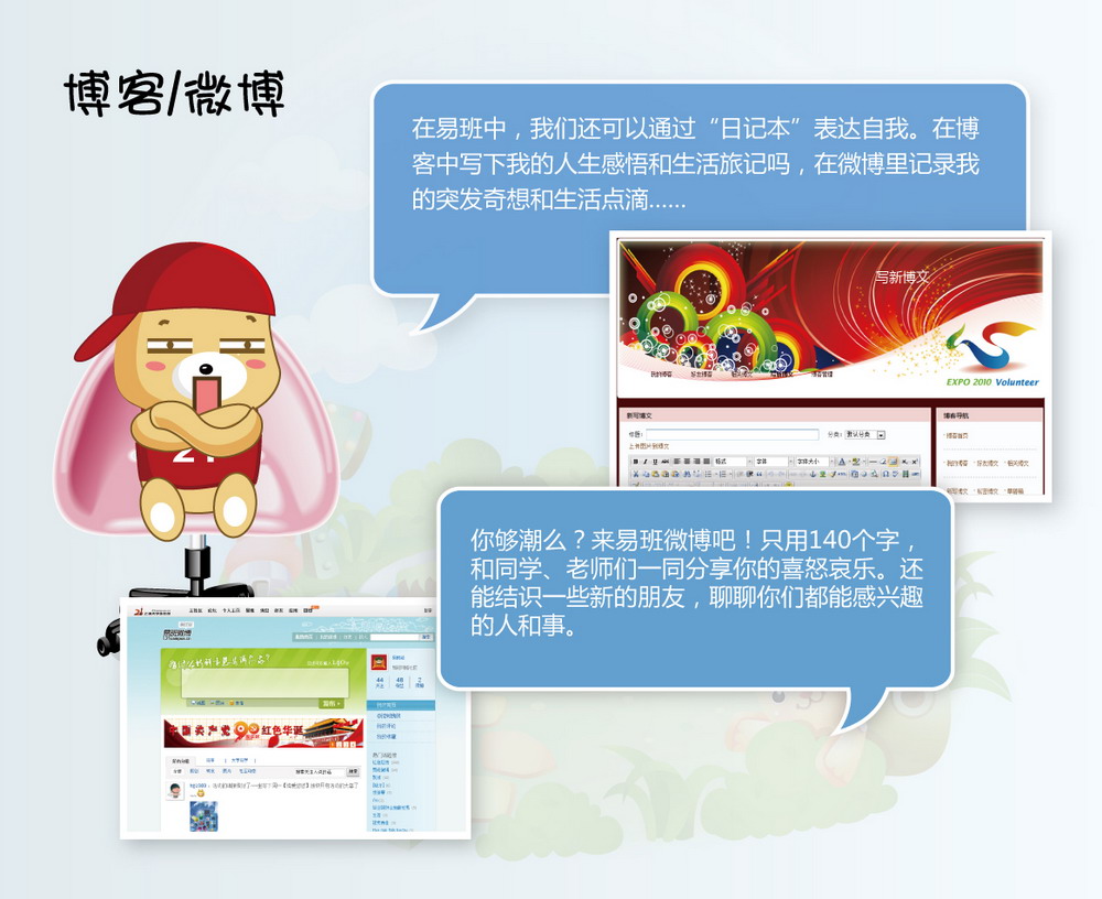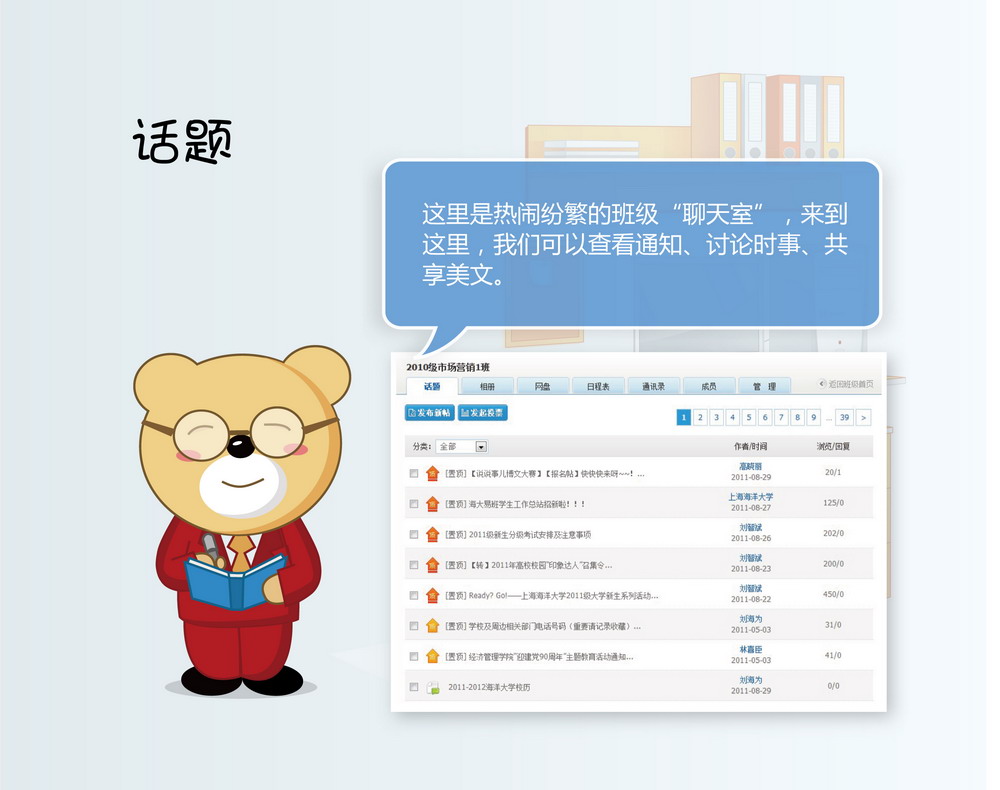 ????? 易班擁有非常強大的班級功能。每個進入西華大學易班的同學都能找到自己相對應的班級,輔導員同時也是班級的管理員,師生們可以在“話題”中發布通知、決策事務、征求意見、尋求幫助、開展活動,也能在此發布投票、評選班委等。 ?????? 在個人主頁,同學們可以實時掌握好友和班級動態,可以收到學校、學院、老師發來的通知,可以定制社團、興趣組織的信息,可以寫博客、傳照片、在網盤上共享資源,甚至和其他師生玩游戲。 ????? “易班”是上海市教衛黨委按照教育部建立大學生網絡互動社區的要求,依托上海市教育系統網絡文化發展研究中心,從2009年開始自主研發的網絡文化建設項目。 ????? 經過近3年的發展,“易班”已經覆蓋上海44所高校,實名注冊用戶超過46萬,共建班級1.9萬個,日均動態數1500萬。上海“易班”建設得到了胡錦濤、李長春、劉云山、劉延東等中央領導同志和上海市委書記俞正聲等領導的批示,各級領導充分肯定了“易班”為大學生提供的在線交流、資源共享、網絡文化活動的平臺作用,并要求對“易班”進行大力支持,并逐漸覆蓋更多高校,發揮更大作用。 ??????? ????????????????????????????????????????????????? 為什么要建易班? ?????? ????? 近年來,學校黨委一直在探索研究如何加強網絡文化建設。學校先后組織人員于2010年、2011年兩次到上海等高校調研,對“易班”的設計思路、建設方法、研發技術、政策支持進行全面了解。 ????? 在認真聽取調研匯報基礎上,4月18日,學校黨委常委會研究決定,學習上海市教委和上海高校的先進經驗,建設西華大學易班。我校的易班建設得到了上海市教衛黨委、四川省教育廳的大力支持,上海市易班發展中心表示將向我校無償提供技術支持。 ?????? 4月25日,學校相關單位召開了西華大學易班建設籌備工作會。會議討論了《西華大學易班建設工作方案(討論稿)》,《方案》主要涉及西華易班建設的組織機構、建設目標、工作步驟等內容。會議決定,學校將組建易班建設領導小組、易班發展中心和易班學生工作站。 ???? 為了順利推進易班建設,我校在上海易班發展中心的指導下,于4月28日開始試用易班。目前人文學院、電氣信息學院、建筑與土木工程學院的部分班級已經注冊成為易班成員。“五一”期間,黨委宣傳部、學生工作部對試點班級的使用情況和存在的問題進行了搜集匯總,并及時向上海易班發展中心反饋。 ????? 5月4日上午,西華大學易班建設培訓會在行政樓報告廳舉行。上海教育系統網絡文化發展研究中心常務副主任朱明倫、上海易班發展中心主任助理陳倩、運維總監吳文越、技術研發工程師賈磊專程來到我校,就“易班”建設的背景、功能、操作流程以及發展趨勢作了詳細介紹。校黨委副書記王小林代表學校對朱明倫主任一行表示熱烈的歡迎,并就易班建設提出了要求。校黨委宣傳部部長張力、校學生工作部部長徐元彬就西華大學易班建設的背景、前期準備情況和要求作了介紹。 ????? 為了方便我校師生安全、快捷、免費使用西華大學易班,經過學校和移動公司、上海教育系統網絡文化發展研究中心協調,我校將建立校內鏡像服務器,實現在校師生免費登錄、使用西華大學易班。目前,西華大學易班的登陸主頁已經建設完成,后臺建設已基本完成,正式面向全校師生開通。 ??????? ??????????????????????????????????????????????????????? 怎么玩轉易班? ??????? ????? 只需點擊http://eclass.xhu.edu.cn/,注冊進入,完善個人資料通過校方驗證,找到自己的班級,你就可以輕松玩轉易班! ????? 在這里,你可以通過微博和博客記錄下生活點滴,與朋友分享喜怒哀樂。 ????? 在這里,你可以發帖與來自五湖四海的朋友談天說地。 ????? 在這里,你可以通過易班無限量的永久相冊功能,記錄下美好的大學時光與同學分享。 ????? 在這里,你可以通過易班 “群組”,根據個人的興趣愛好加入網上興趣小組、網上社團,與志同道合的朋友聚集到一起。 ????? 在這里,你可以通過易班 “網盤”,獲得無限量、高速的網上存儲空間,可以將資料存入網盤與其他高校師生分享。 ???? ?在這里,通過易班 “通訊錄”功能,加入班級后,你可以隨時更新自己的電話和郵箱,這樣畢業多年,也還能和同學保持聯系。 ????? 在這里,你還可以通過易班 “im即時通訊”功能,與好友在線聊天,并異地備份聊天記錄。 ???? 在這里,老師可以通過易班短信將通知信息群發到班級同學的手機上。而且,“掌上易班”即將開通,到時候通過手機可以隨時登陸易班。 ????? …… ??? 同學們,易班來了,你們準備好了嗎? 易班功能介紹圖(一) 易班功能介紹圖(二) 易班功能介紹圖(三) 易班功能介紹圖(四) 易班功能介紹圖(五) 易班功能介紹圖(六)
