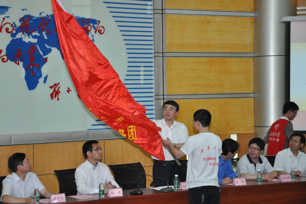 校黨委副書記王小林代表學校為“三下鄉”社會實踐活動的校院團隊授旗 |