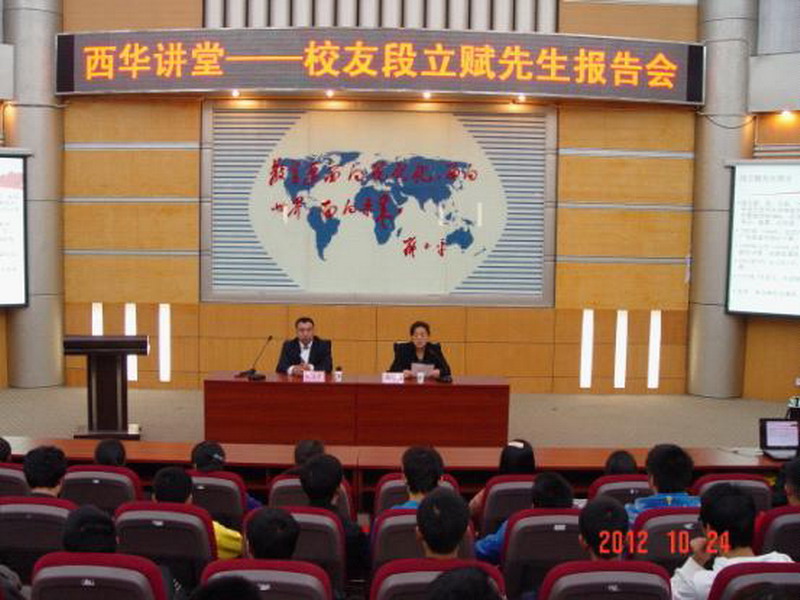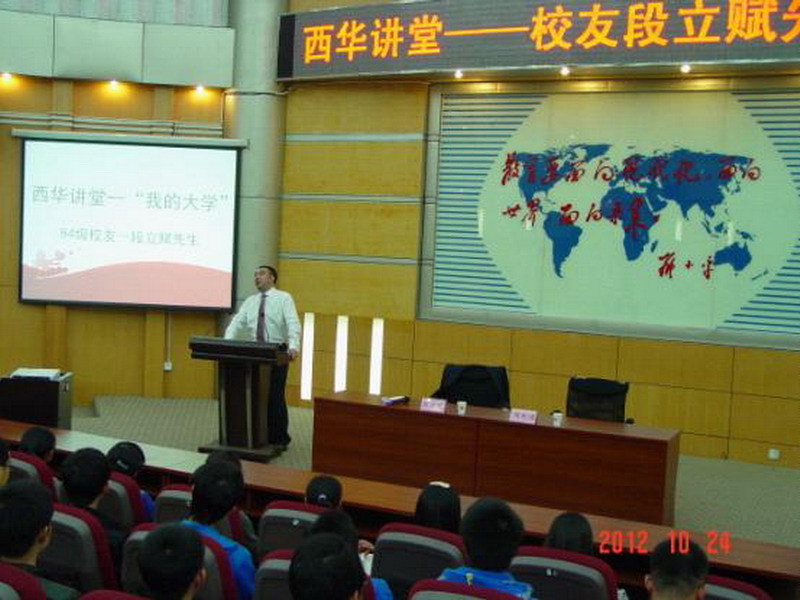 ????? 10月24日晚7時,成都成彭高速公路有限責(zé)任公司黨委書記、董事長、總經(jīng)理、84級校友段立賦先生作客西華講堂,為生物工程學(xué)院學(xué)子帶來一場題為“我的大學(xué)”的勵志講座。講座由生物工程學(xué)院黨委書記周彬儒主持,學(xué)院部分青年教師聆聽了此次講座。