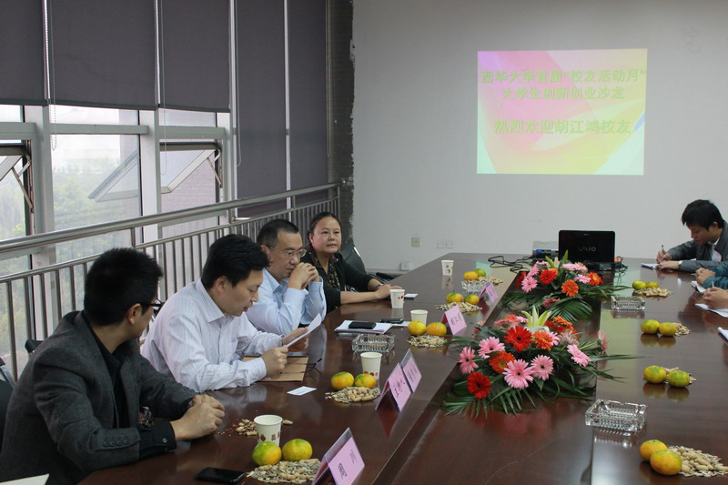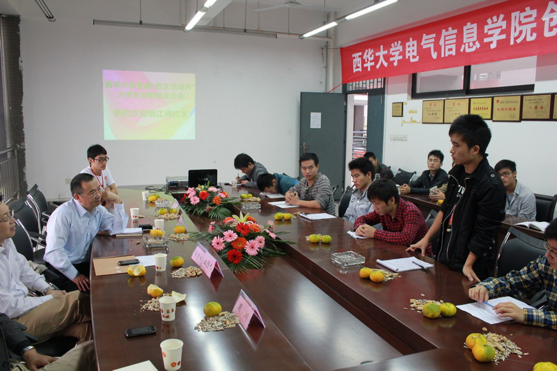 9月25日上午,西華大學首屆校友活動月之創新創業沙龍活動在電氣信息學院會議室6A301順利舉行。參加本次活動的有我校校友東方電氣集團東風電機有限公司總經理胡江鴻,電氣信息學院黨委書記董秀成,院長王軍,院黨委副書記周川,學院全體專職輔導員,學院2010級、2009級學生代表等共計50余人。董秀成書記主持本次座談會。