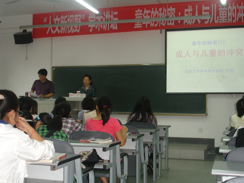 ????? 5月30日上午,應(yīng)人文學(xué)院邀請(qǐng),成都大學(xué)學(xué)前教育學(xué)院副院長(zhǎng)盧偉教授在6C--225給學(xué)前教育專(zhuān)業(yè)師生帶來(lái)了一場(chǎng)題為《童年的秘密:成人與兒童的沖突》講座,副院長(zhǎng)潘殊閑主持講座。 |
