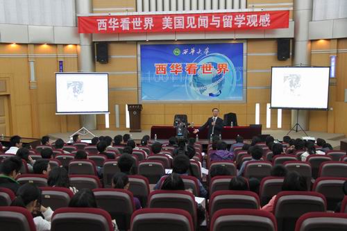 ??? 11月12日下午,“西華看世界”第一期講座在四教報(bào)告廳如期舉行。校長(zhǎng)孫衛(wèi)國(guó)作了題為《美國(guó)見聞與留學(xué)觀感》的報(bào)告。400余名師生前來聽取報(bào)告。?? ??? 孫校長(zhǎng)從美國(guó)國(guó)旗和國(guó)花切入,分別就美國(guó)的國(guó)家性質(zhì)、人員結(jié)構(gòu)、領(lǐng)土的擴(kuò)張、早期的重大歷史事件等幾個(gè)方面,詳細(xì)地講述了美國(guó)是如何迅速崛起并發(fā)展成為頭號(hào)強(qiáng)國(guó)的。其中,孫校長(zhǎng)重點(diǎn)講述了華盛頓等幾位在美國(guó)歷史上有重大影響的總統(tǒng)的經(jīng)歷,一個(gè)個(gè)充滿哲思的故事,客觀深入的剖析,使在場(chǎng)師生對(duì)美國(guó)有了更加深刻的認(rèn)識(shí),受益匪淺。 ??? 此次講座為“西華看世界”第一期第一講。據(jù)悉,在第二講中,孫校長(zhǎng)將從移民對(duì)美國(guó)的貢獻(xiàn)、美國(guó)社會(huì)面面觀等幾方面更加深入的剖析美國(guó)文化與美國(guó)社會(huì)。