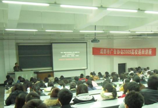 近日,成都市廣告協會2009年高校巡回講座在6B-107舉行。講座由成都市飛揚廣告設計公司總經理楊帆主講。藝術學院副院長屈立豐及部分老師、同學聆聽了此次講座。