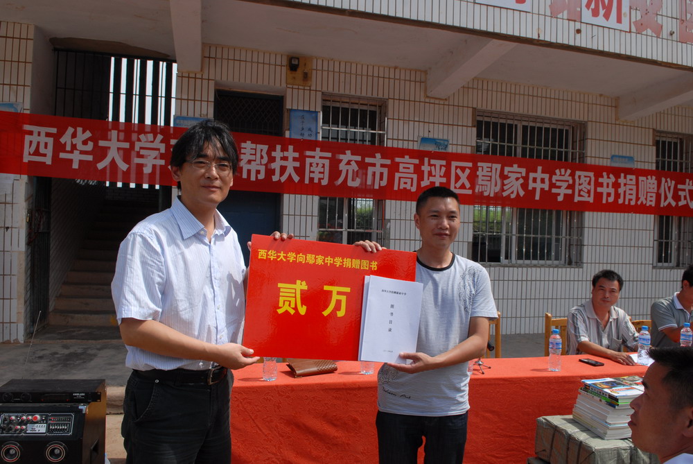 學校黨委常委、校長辦公室主任費凌(左一)代表學校向鄢家中學捐贈了圖書