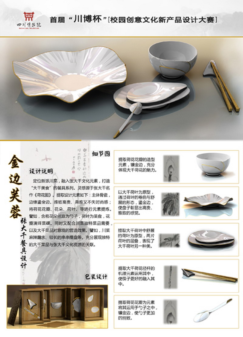 首屆“川博杯”校園文化產品設計大賽于5月19日晚在四川博物院舉行了盛大的頒獎典禮。來自西華大學、成都理工大學、成都大學、西南民族大學等院校的60件藝術作品成功入圍,頒獎典禮對獲得大賽的一、二、三等獎的優秀作品進行了最高一萬元人民幣的現金獎勵。其中,來自西華大學藝術學院工業設計系的丁侃和其團隊的設計作品《金邊芙蓉》、李小永的設計作品《吉祥云》、楊平的設計作品《編鐘筆》包攬了大賽所有的3個一等獎。此外,以張大千名作《荷花圖》為靈感的“大千美食”系列餐具《金邊芙蓉》還獲得全場最實用設計大獎,被四川寶光文化產業發展有限公司相中,作品的設計團隊受邀在頒獎典禮上進行了工作意向簽約儀式。 由四川博物院主辦的首屆“川博杯”校園創意文化產品設計大賽在去年12月正式啟動,面向省內大中專院校學生,征集以四川博物院館藏文物或巴蜀文化為主題元素的動漫類、工業設計類、平面設計類原創作品。大賽設一等獎3名,每名獎金1萬元;二等獎6名,每名獎金5000元;三等獎10名,每名獎金3000元。大賽還設有最佳人氣設計獎、最佳實用設計獎,獎金各5000元。此次大賽共收到600余件參賽作品。 此次“川博杯”校園創意文化產品設計大賽是在歷屆四川高校文化創意比賽中規模最大,參賽人數最多,優秀作品涌現最多,獎項設立最多的一次。大賽旨在鼓勵四川省青年了解并發掘巴蜀民族文化,推出新型文化創意設計產品,培育四川青年創作能力,進一步為設計愛好者和專業人士提供一個學習和交流的機會。 在本次成都諸多高校參與的競賽中,西華大學藝術學院工業設計系可謂“大獲全勝”:在19個等級獎中西華大學就獲得了9個;在60個入圍作品中,超過一半數量的作品均來自于西華大學。本次設計作品主要由王崇東老師、孟凱寧老師、周睿老師進行設計指導;西華大學獲得了最佳組織單位獎。