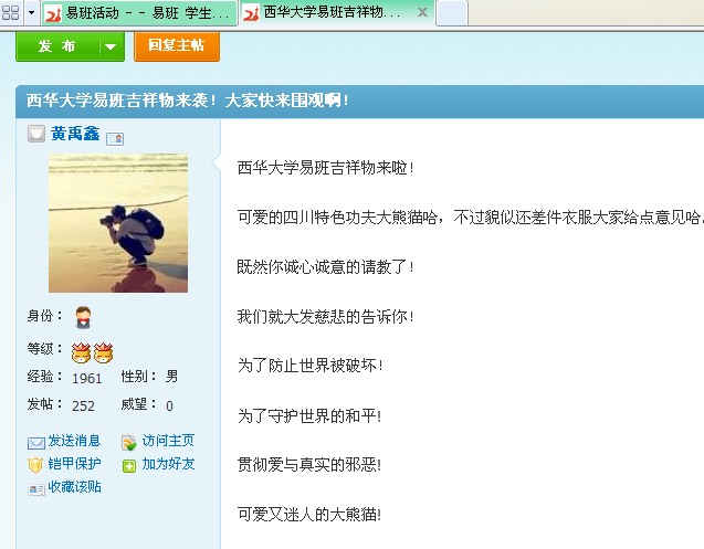 ????? 近段時(shí)間,西華大學(xué)易班活動(dòng)頻繁,易班優(yōu)秀集體獎(jiǎng)申報(bào)活動(dòng)、制作西華大學(xué)易班吉祥物、“四六級(jí)考前輔導(dǎo)”活動(dòng)、“易班形象大使”選拔活動(dòng)、西華大學(xué)易班l(xiāng)ogo和登陸頁面評(píng)選初賽、西華大學(xué)班級(jí)創(chuàng)意全家福等活動(dòng)先后展開。通過線上、線下活動(dòng)的良好互動(dòng),更好地發(fā)揮了易班服務(wù)學(xué)生、營造良好學(xué)習(xí)氛圍的作用。 ????? 活動(dòng)一:易班發(fā)展中心開展易班優(yōu)秀集體獎(jiǎng)申報(bào)活動(dòng) ???????? ????? 為激勵(lì)易班建設(shè)先進(jìn)集體,加強(qiáng)各學(xué)院易班建設(shè)工作總結(jié)和經(jīng)驗(yàn)交流,易班發(fā)展中心根據(jù)《西華大學(xué)易班建設(shè)工作獎(jiǎng)勵(lì)辦法》,組織開展了易班建設(shè)集體獎(jiǎng)申報(bào)及評(píng)選活動(dòng)。 ????? 評(píng)選活動(dòng)設(shè)“西華大學(xué)易班建設(shè)先進(jìn)集體”10個(gè)、“西華大學(xué)易班建設(shè)先進(jìn)班級(jí)”10個(gè)。“先進(jìn)集體”在21個(gè)學(xué)院中產(chǎn)生,“先進(jìn)班級(jí)”在西華大學(xué)易班已注冊(cè)的900余個(gè)班級(jí)中產(chǎn)生。參評(píng)學(xué)院或班級(jí)向易班發(fā)展中心提交申報(bào)材料,易班發(fā)展中心根據(jù)各學(xué)院申報(bào)材料初選后,選擇部分學(xué)院作現(xiàn)場(chǎng)陳述,最后根據(jù)綜合評(píng)比成績,評(píng)選出獲獎(jiǎng)學(xué)院。 ?????????????? 活動(dòng)二:易班學(xué)生工作站設(shè)計(jì)制作西華大學(xué)易班吉祥物 ???????? ????? 日前,易班學(xué)生工作站通過廣泛征集意見和內(nèi)部討論之后,制定了西華大學(xué)易班吉祥物方案。 ????? 西華大學(xué)易班吉祥物將在“上海易班21世紀(jì)熊”構(gòu)思的基礎(chǔ)上,大膽融入巴蜀特色,通過四川特有的世界級(jí)珍稀動(dòng)物熊貓的原型,創(chuàng)造性地開發(fā)出具有濃郁四川特色的“西華易班21世紀(jì)功夫熊貓”吉祥物。 ????? 不久,“西華易班21世紀(jì)功夫熊貓”吉祥物將會(huì)和廣大西華易友見面,屆時(shí)西華易友們將有機(jī)會(huì)和可愛的“西華易班21世紀(jì)功夫熊貓”合影。 ????????? ? 活動(dòng)三:西華大學(xué)易班l(xiāng)ogo和登陸頁面評(píng)選初賽落幕 ???????? ?????? 西華大學(xué)易班l(xiāng)ogo和登陸頁面設(shè)計(jì)大賽開展以來,受到了全校同學(xué)的廣泛關(guān)注,同學(xué)參與大賽的積極性非常高,短短時(shí)間內(nèi),易班學(xué)生工作站就收到了100余份參賽作品。 ????? 經(jīng)過學(xué)生工作站工作人員對(duì)作品的整理、歸類,采取易班網(wǎng)絡(luò)投票、各學(xué)院易班聯(lián)系代表及工作站工作人員現(xiàn)場(chǎng)投票相結(jié)合的方式,選出了25份優(yōu)秀作品。投票活動(dòng)引起了西華易友的熱烈反響,據(jù)不完全統(tǒng)計(jì),投票帖總計(jì)瀏覽量達(dá)8000多,參與投票的人數(shù)達(dá)1800人。接下來,易班學(xué)生工作站將報(bào)送初選作品到學(xué)校易班建設(shè)工作領(lǐng)導(dǎo)小組和易班發(fā)展中心進(jìn)行最終評(píng)審與修改,選出具有西華特色的易班l(xiāng)ogo和登陸界面。 ???????? 活動(dòng)四:易班學(xué)生工作站舉行“四六級(jí)考前輔導(dǎo)”活動(dòng) ?????? ????? 6月16日,即將迎來今年我校第一場(chǎng)英語四六級(jí)考試。為了緩解同學(xué)們的緊張情緒,幫助同學(xué)們掌握迎考技巧,增強(qiáng)同學(xué)們考前沖刺的信心,易班學(xué)生工作站特邀外國語學(xué)院英語教學(xué)一部系主任徐紅英老師和教學(xué)二部系主任李學(xué)芹老師,考前現(xiàn)場(chǎng)為廣大同學(xué)解答四六級(jí)疑問。 ????? 本次活動(dòng)采用易班微訪談、易班論壇和現(xiàn)場(chǎng)訪談相結(jié)合的方式開展。為了更好地宣傳此次活動(dòng),除了在西華大學(xué)易班發(fā)起活動(dòng)外,易班學(xué)生工作站還進(jìn)行了戶外宣傳和微博宣傳。該項(xiàng)活動(dòng)將采用網(wǎng)上跟帖搶票的方式抽取幸運(yùn)觀眾,參加面對(duì)面的現(xiàn)場(chǎng)輔導(dǎo)。 ????? 本次“四六級(jí)考前輔導(dǎo)”是通過易班開展學(xué)習(xí)活動(dòng)的有益嘗試,通過線上、線下活動(dòng)的良好互動(dòng),可以更好地發(fā)揮易班服務(wù)學(xué)生、營造良好學(xué)習(xí)氛圍的作用。 ???????? 活動(dòng)五:各學(xué)院“易班形象大使”選拔活動(dòng)持續(xù)火熱進(jìn)行 ???????? ????? 繼交通與汽車工程學(xué)院、人文學(xué)院、物理與化學(xué)學(xué)院、材料科學(xué)與工程學(xué)院成功地在易班上開展形象大使選拔活動(dòng)之后,機(jī)械工程與自動(dòng)化學(xué)院、建筑與土木工程學(xué)院也相繼跟進(jìn),紛紛開展“易班形象大使”選拔活動(dòng)。 ????? 各學(xué)院的“易班形象大使”選拔活動(dòng)持續(xù)升溫,來自不同學(xué)院的同學(xué)們青春靚麗的照片吸引了西華易友和上海易友的廣泛關(guān)注,在易班上引起了強(qiáng)烈反響。 ????? 不久,“西華大學(xué)易班學(xué)生工作站明星代言人”將出現(xiàn)在西華大學(xué)易班的各種活動(dòng)中。 ???????? 活動(dòng)六:易班學(xué)生工作站啟動(dòng)西華大學(xué)班級(jí)創(chuàng)意全家