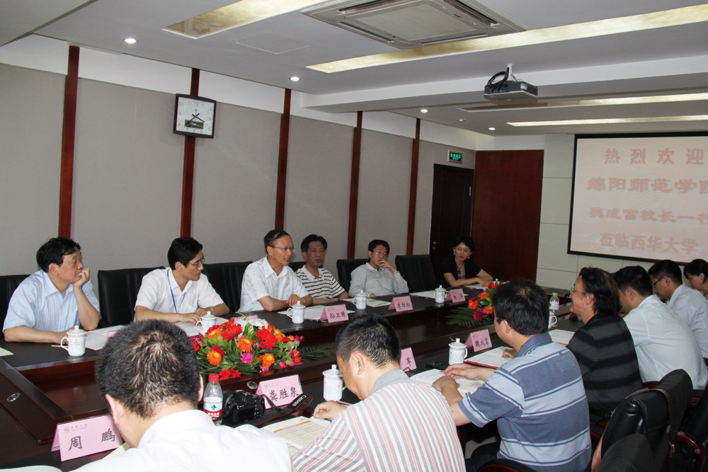 ????? 5月11日下午,綿陽師范學院魏成富校長帶領學校黨委辦公室、校長辦公室主任彭軍,人事處處長唐再良,圖書館館長龔勝泉等部門負責人一行到我校考察交流。校長孫衛國,副校長李勁松,校長辦公室主任費凌、人事處處長楊偉、圖書館館長呂先競等相關部門負責人參加了在行政樓412會議室舉行的座談交流會。副校長李勁松主持座談會。