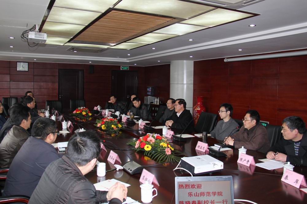 ????? 3月15日下午,樂山師范學院副校長陳曉春帶領教務處、物理與電子工程學院、化學與生命科學學院、文學與新聞學院、美術學院、計算機科學學院等單位負責人一行到我校考察交流。我校副校長何建平,教務處、物資設備與實驗室管理處、物理與化學學院、生物工程學院、人文學院、藝術學院、數學與計算機學院等院部負責人參加了座談。