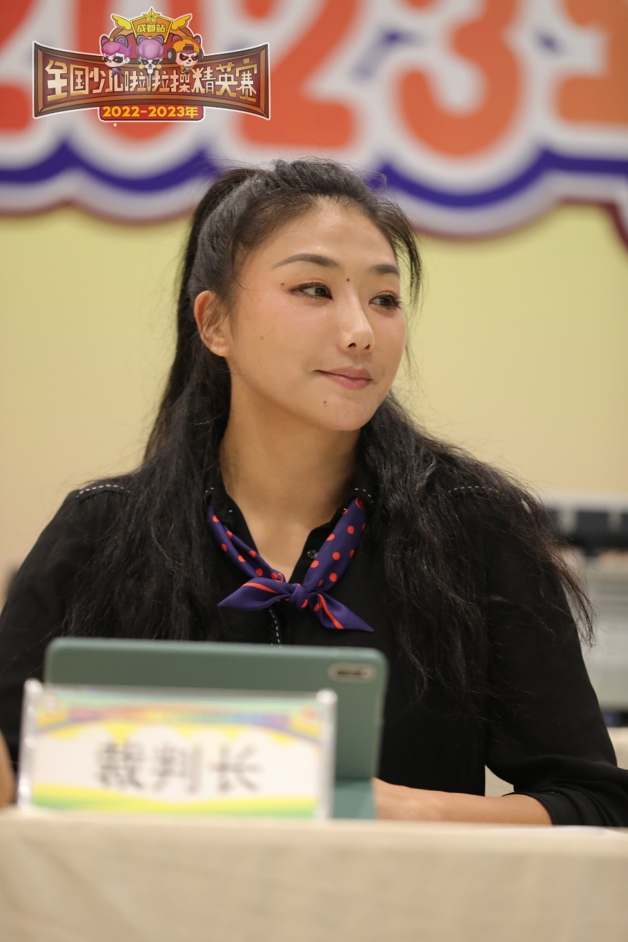 張謳在擔任全國少兒啦啦操精英賽的裁判工作。