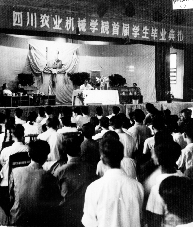 1960 年下半年,在學校校址都沒有確定的情況下,8月我校招收了第一批農業機械設計與制造、農業生產過程機械化兩個本科專業學生300名。并被安排在重慶市北培區,“借讀”于西南農學院,學習一年的基礎課。1961年8月,學院從原四川省農機化學校接收了部分房屋建筑,從此,四川農業機械學院有了校址,即今天以第四教學樓為中心占地80余畝的區域。
