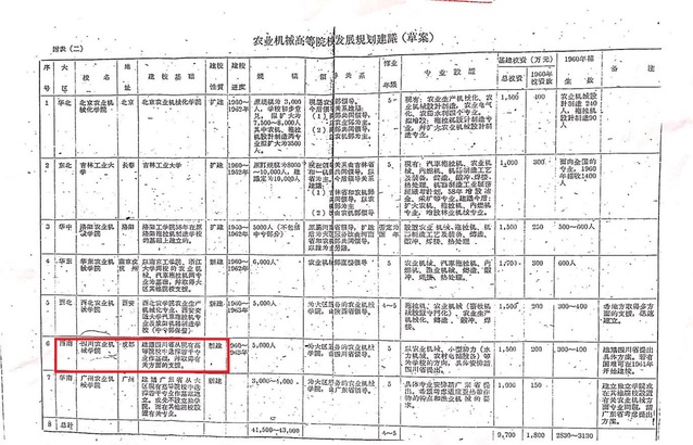 1960-1963年為建校期間,建議四川省從現有高等院校中選擇若干專業作為基礎,并取得有關方面支持;學校規模5000人,主要為西南大區服務的農業機械學院,由四川省領導; 修業年限為5年; 專業設置以農業機械、小型給排水機械、農業電站設備等為學校發展的方向,具體安排請四川省提出意見: 基本建設投資1500 萬人民幣,1960 年投資200 萬人民幣; 1960 年招生300~400 人,建議四川省提出具體方案,若有困難,可以1961年建校。”